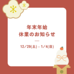 - 年末年始休暇今年も残りわずかとなってきましたね。年末年始休暇をお知らせします。12/27(土)-1/4(日) ※メール問い… 続きを読む: 年末年始休暇